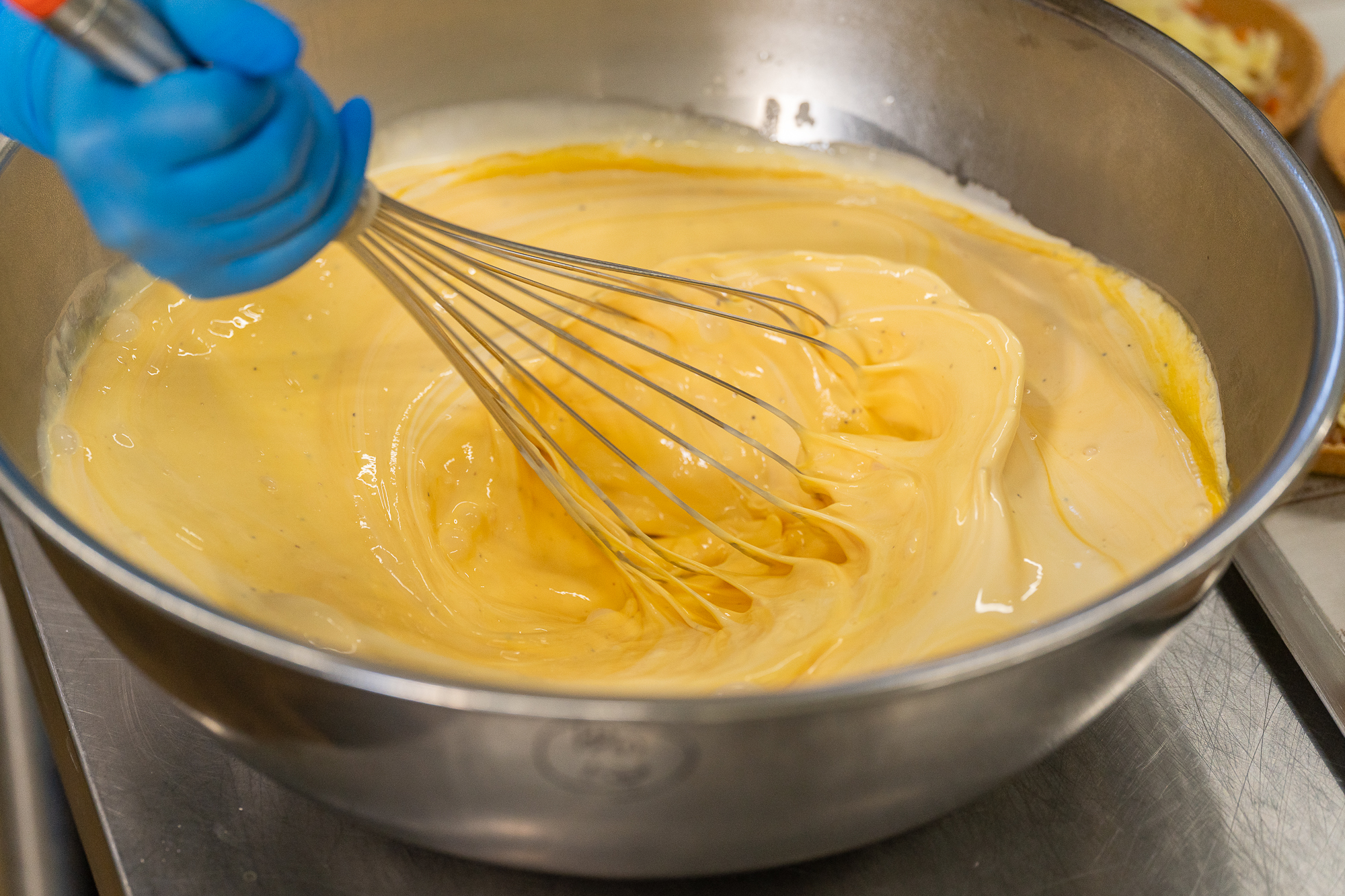(玉子豆腐)は自社生産のベジタブル鶏卵、茶卵をふんだんに使用しており、合せ出汁には四万十鶏のガラ(骨)から手間暇3時間かけて殻スープを抽出し卵と合わせております。一般的な玉子豆腐と比べて卵の風味がとても濃厚でそのままでも非常に上品で濃厚な玉子豆腐です。